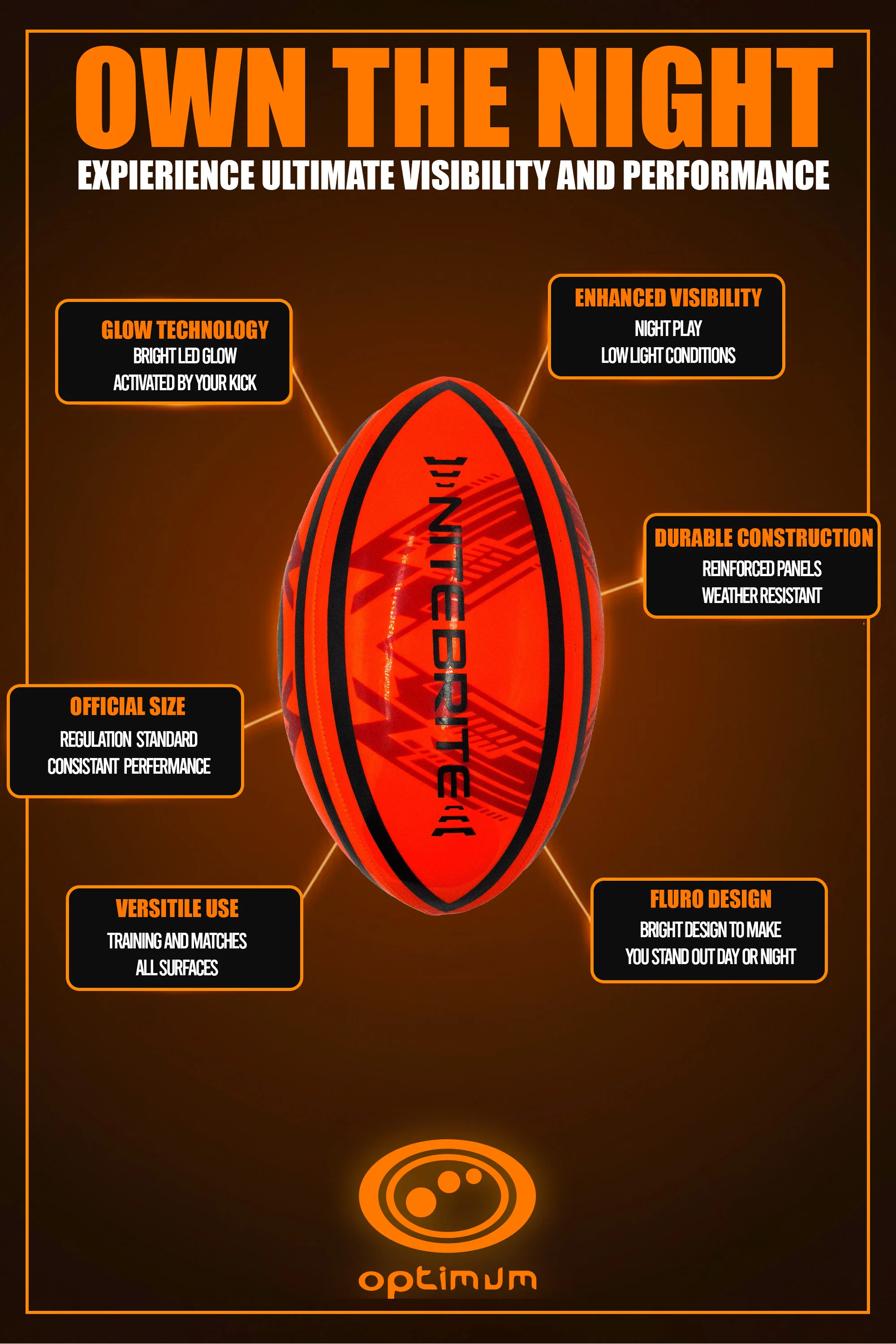 Optimum LED Glow Rugby Ball Size 5 – Motion Activated with Auto-Off | Durable Water-Resistant Night Play | Includes Pump & Spare Batteries | UK Sports Brand
